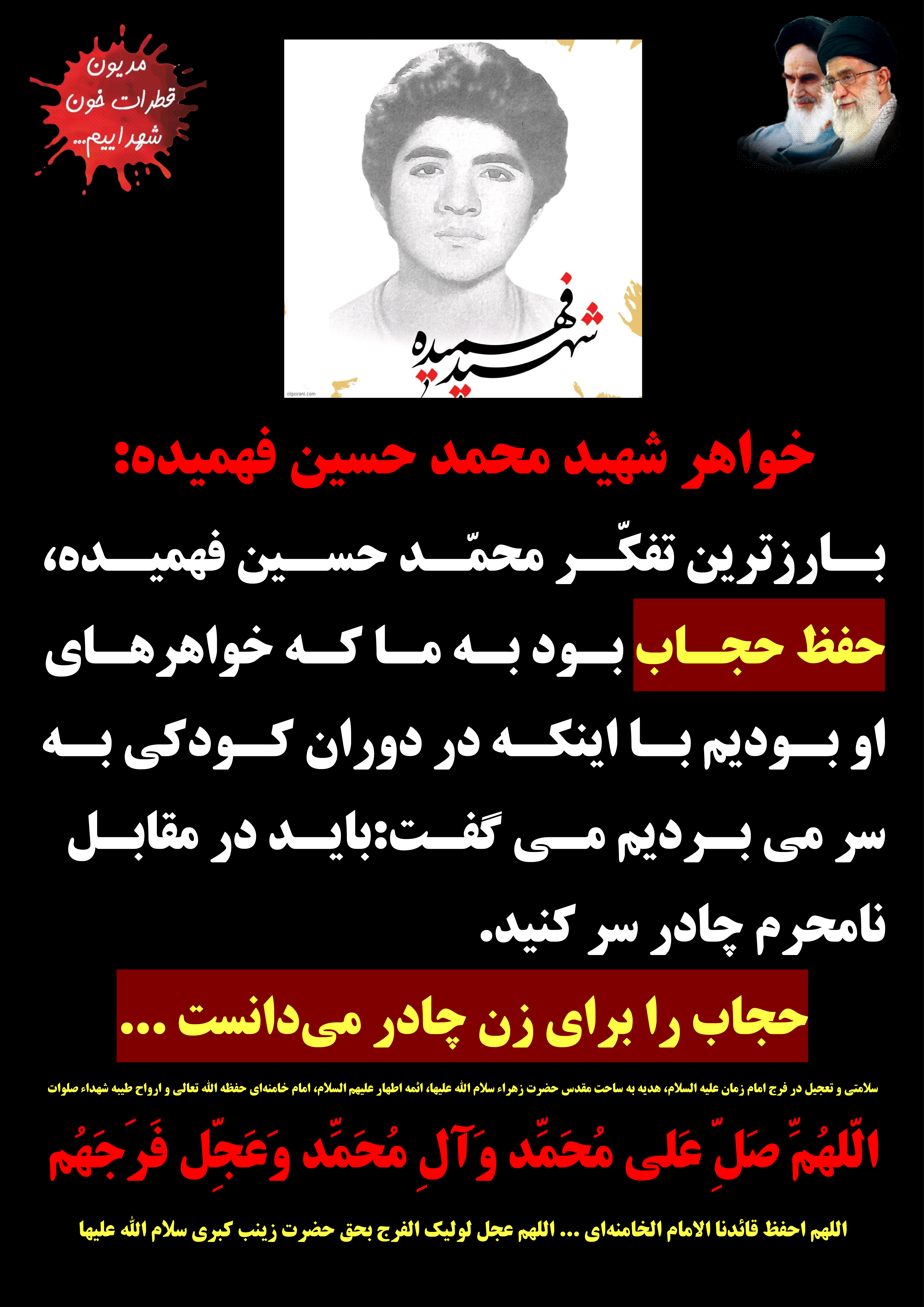 بارزترین تفکّر محمّد حسین فهمیده، حفظ حجاب بود به ما که خواهرهای او بودیم با اینکه در دوران کودکی به سر می بردیم می گفت:باید در مقابل نامحرم چادر سر کنید.