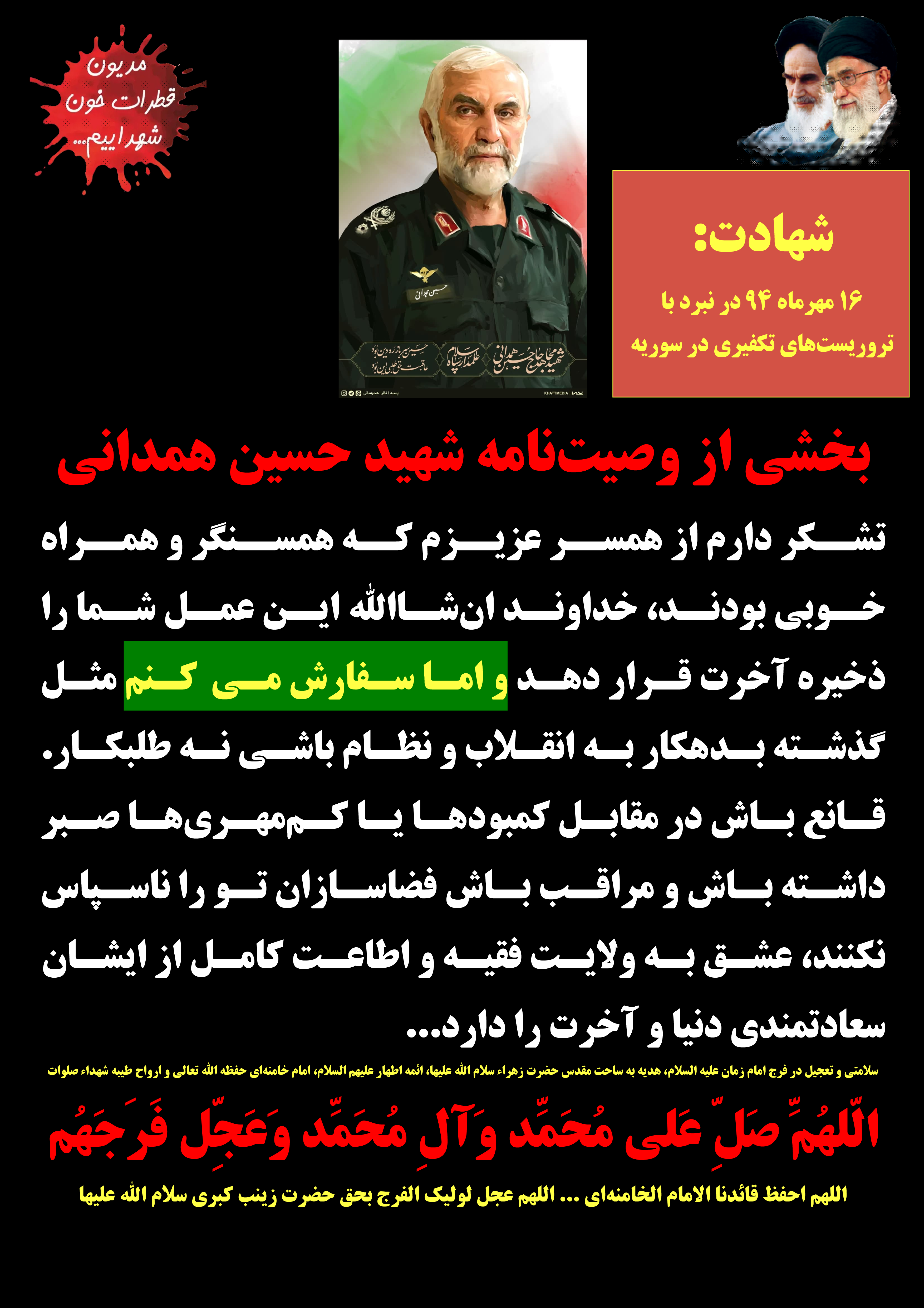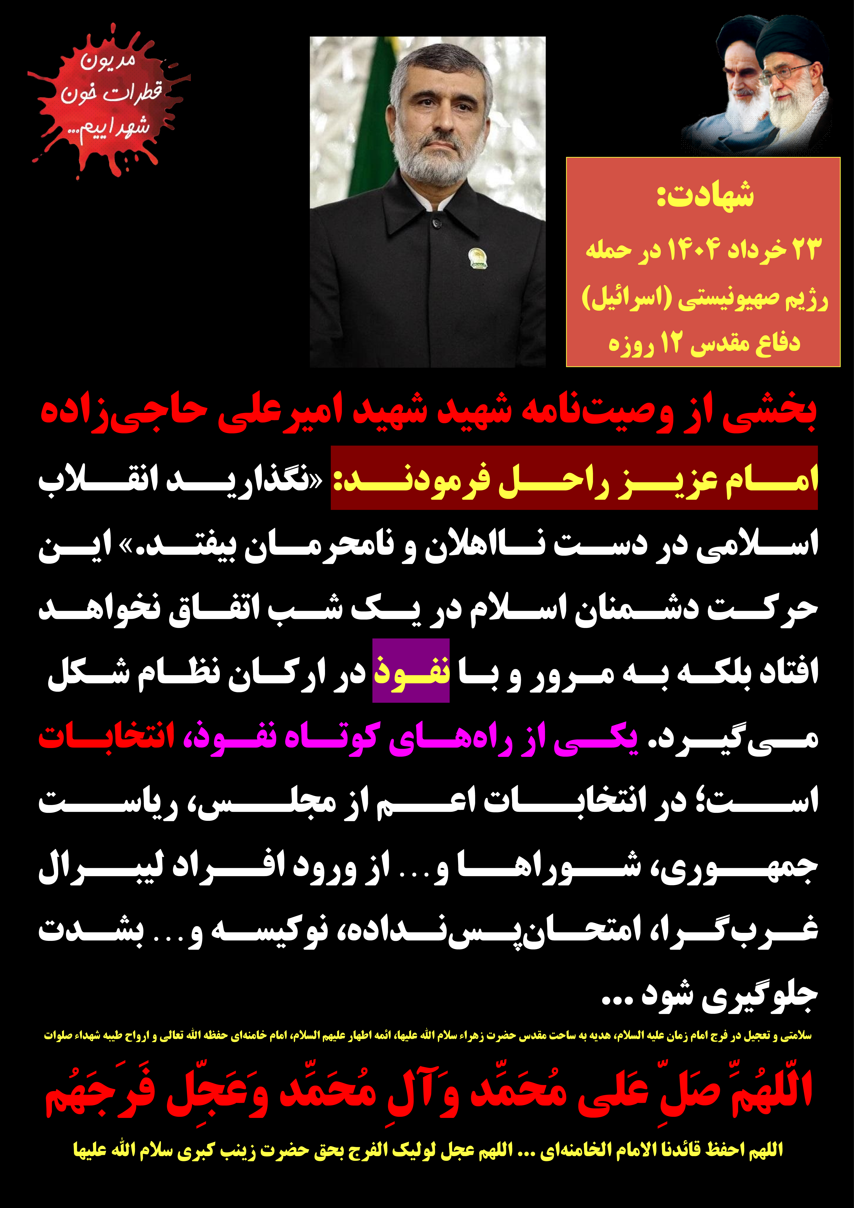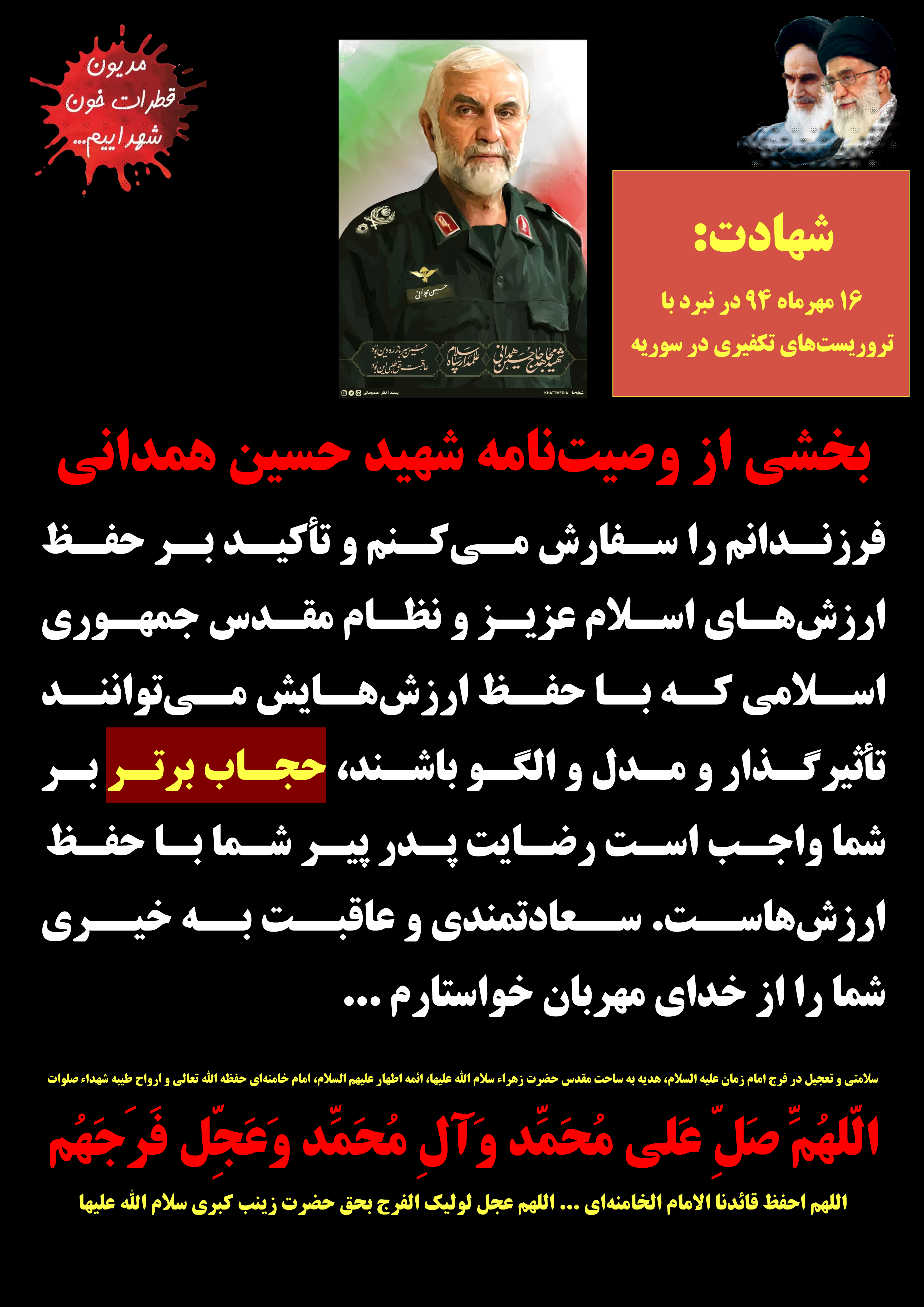 فرزندانم را سفارش میکنم و تأکید بر حفظ ارزشهای اسلام عزیز و نظام مقدس جمهوری اسلامی که با حفظ ارزشهایش میتوانند تأثیرگذار و مدل و الگو باشند، حجاب برتر بر شما واجب است رضایت پدر پیر شما با حفظ ارزشهاست. سعادتمندی و عاقبت به خیری شما را از خدای مهربان خواستارم ...