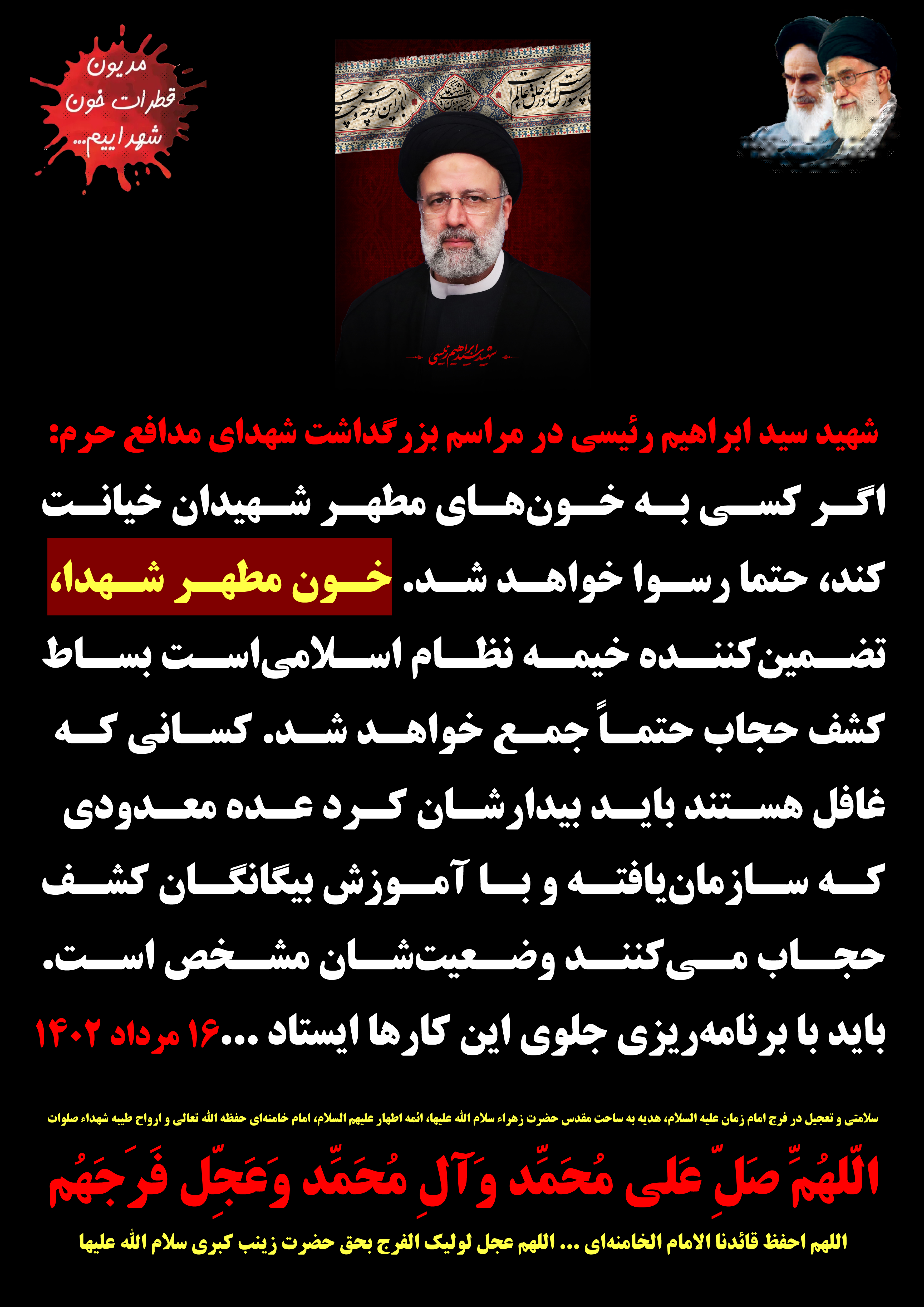اگر کسی به خونهای مطهر شهیدان خیانت کند، حتما رسوا خواهد شد. خون مطهر شهدا، تضمینکننده خیمه نظام اسلامیاست بساط کشف حجاب حتماً جمع خواهد شد. کسانی که غافل هستند باید بیدارشان کرد عده معدودی که سازمانیافته و با آموزش بیگانگان کشف حجاب میکنند وضعیتشان مشخص است. باید با برنامهریزی جلوی این کارها ایستاد ...