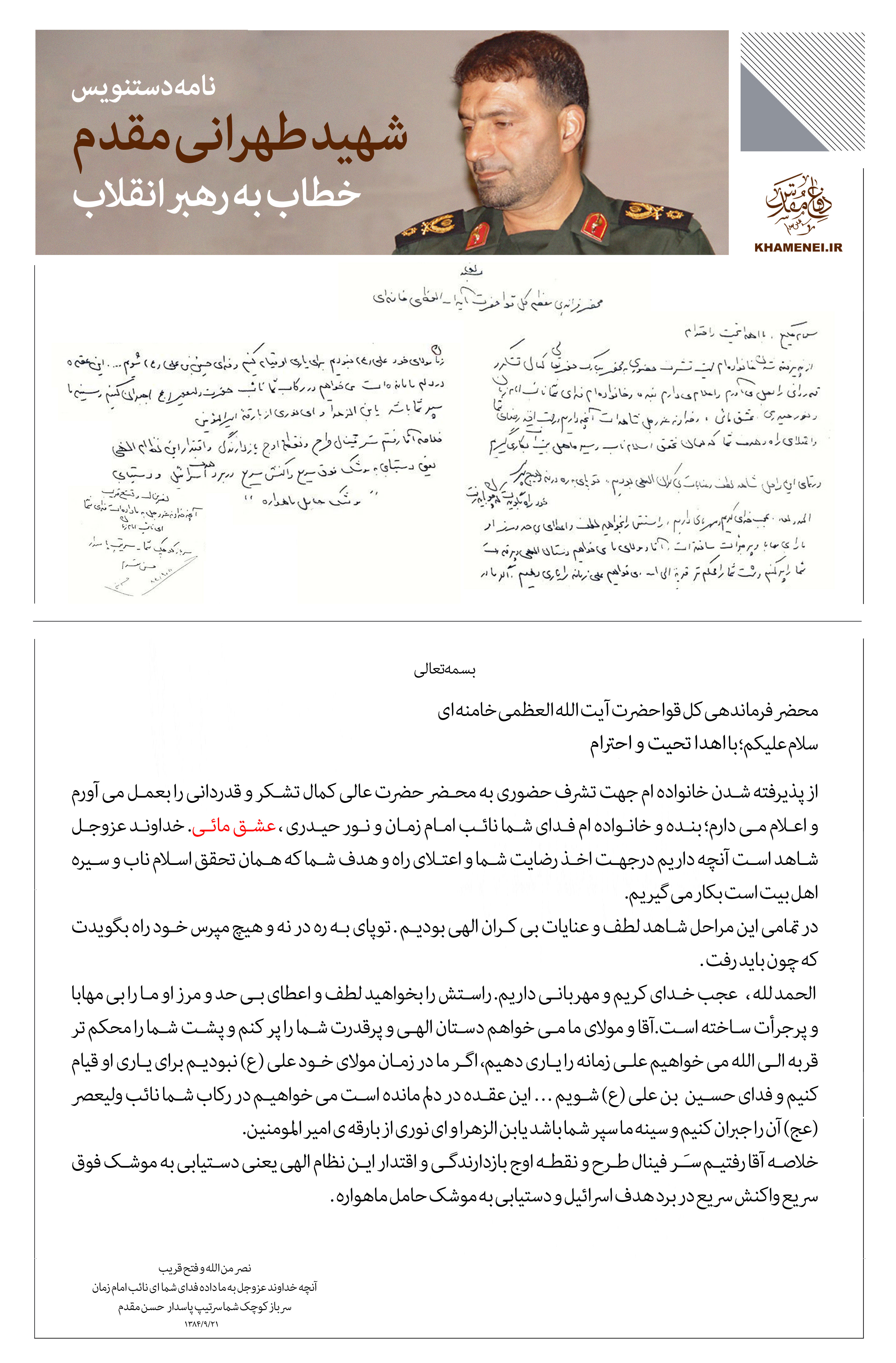 نامه دستنویس شهید طهرانی مقدم خطاب به رهبر انقلاب