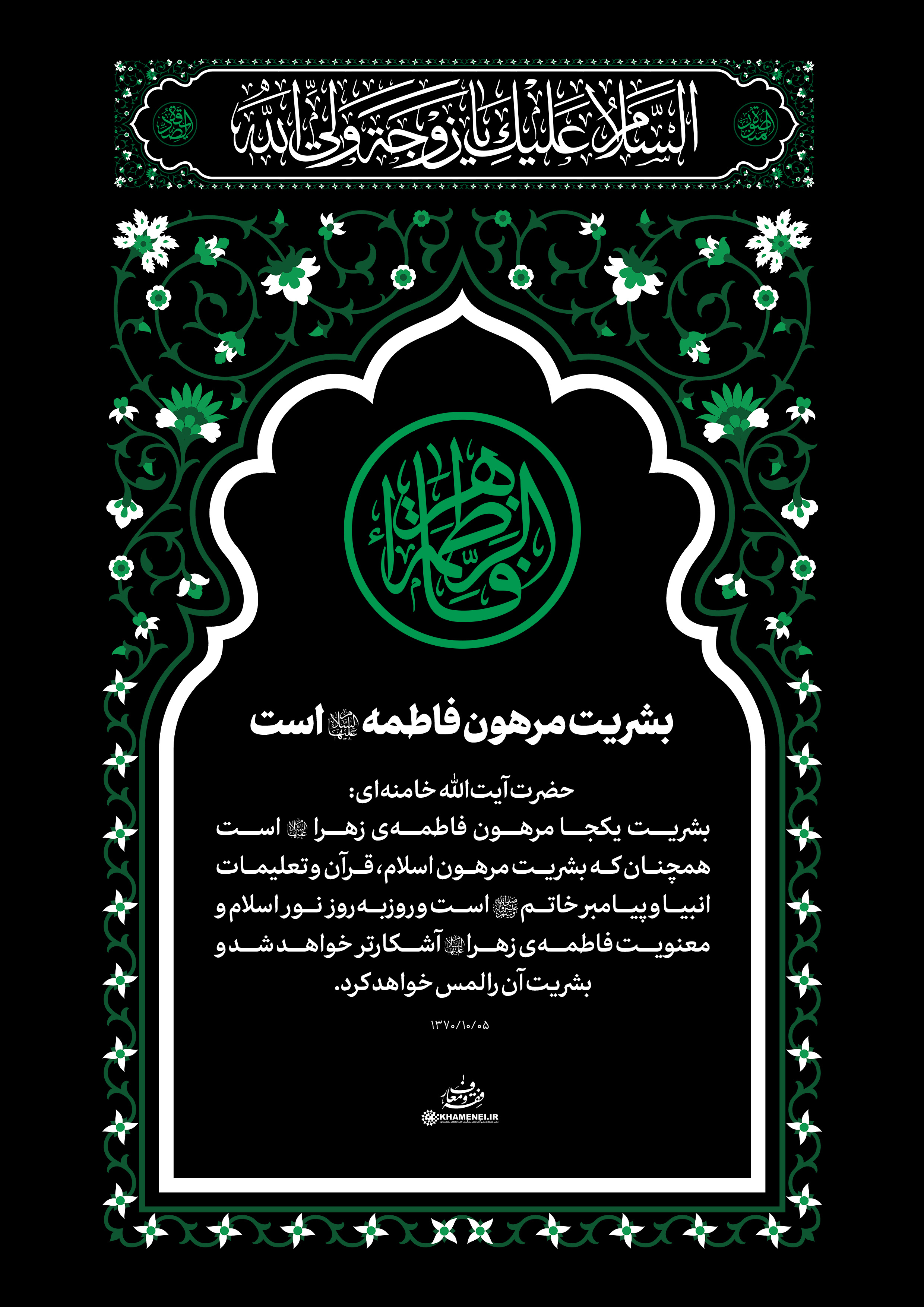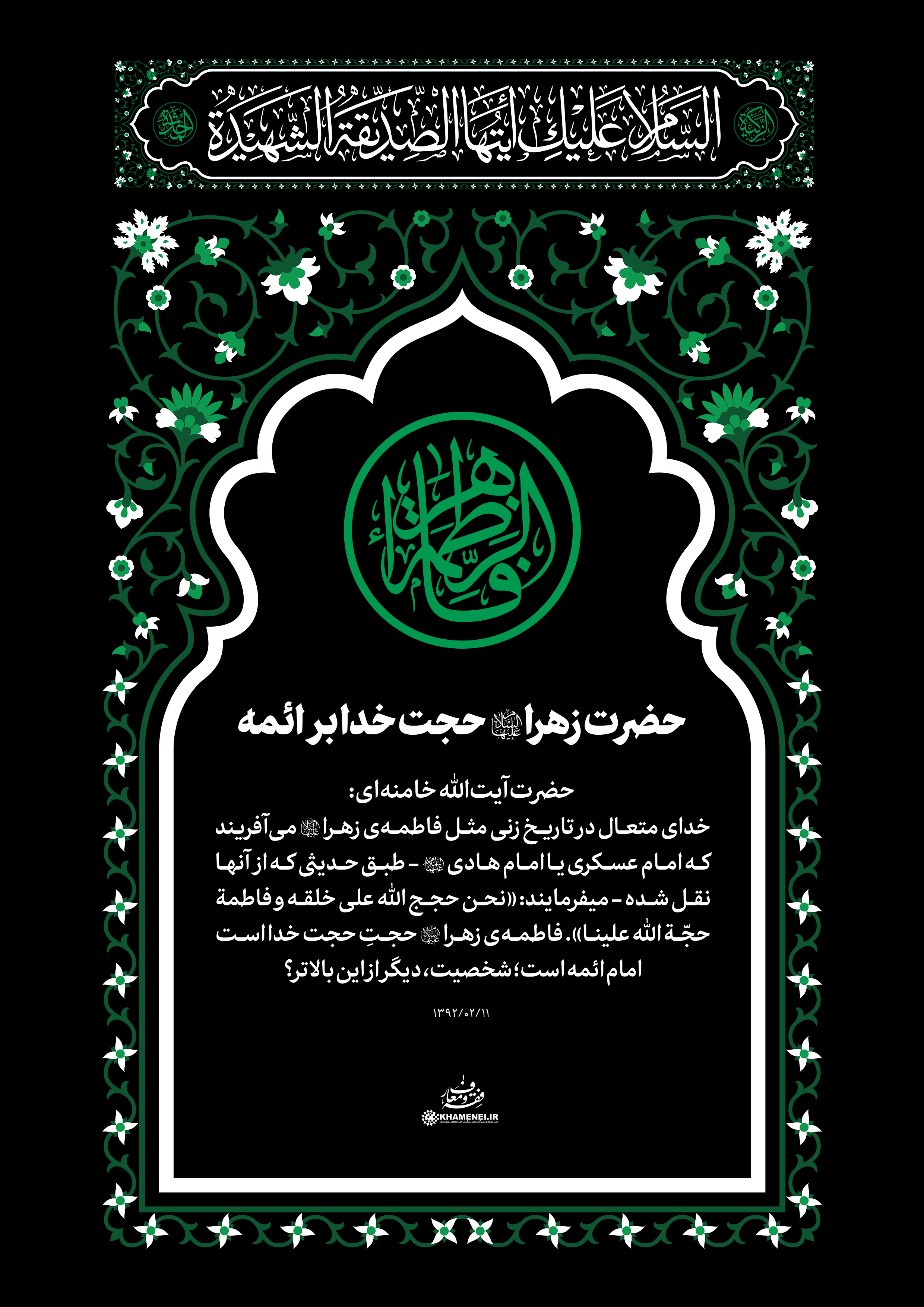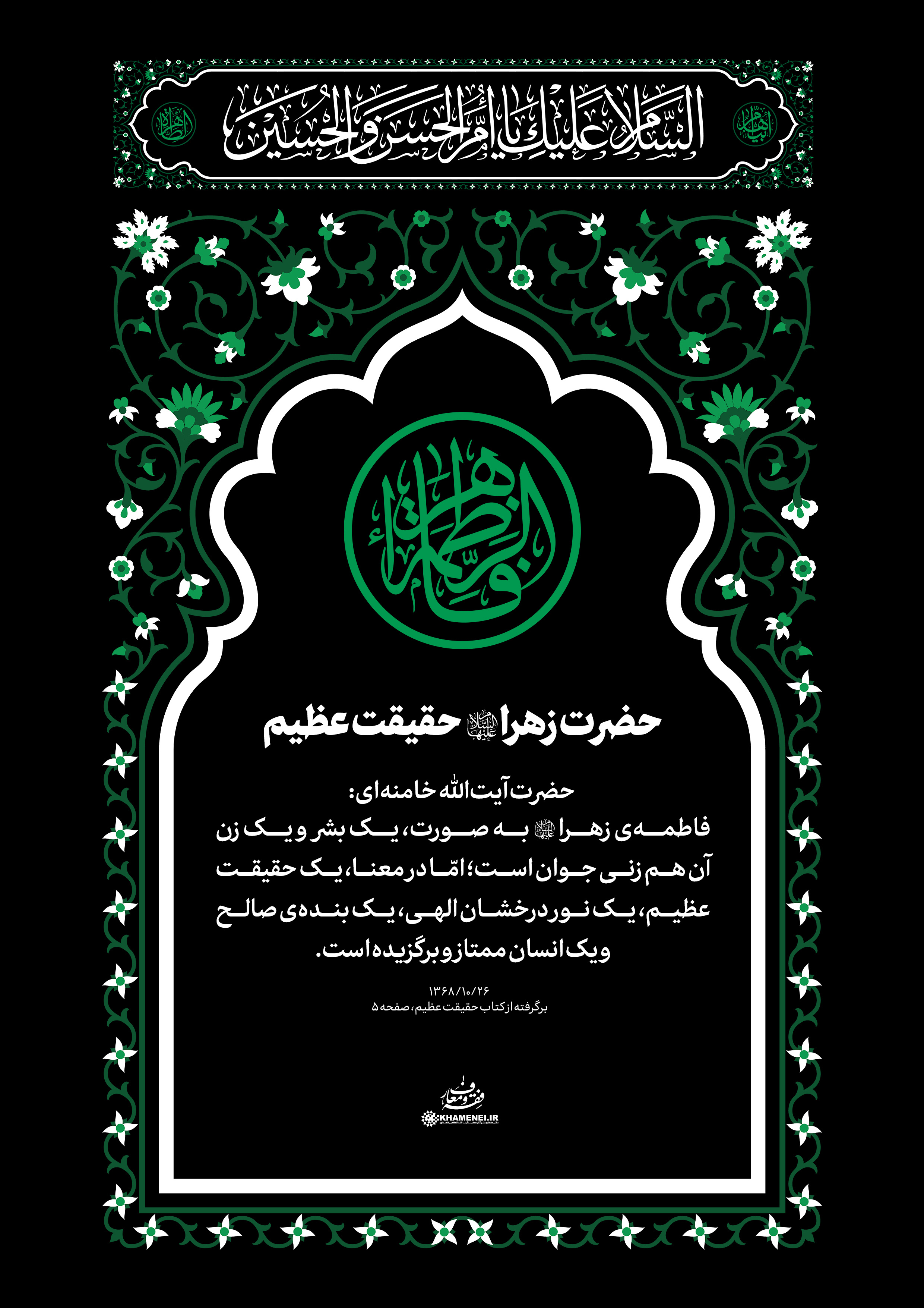 حضرت آیتالله خامنهای: فاطمهى زهرا سلاماللهعلیها به صورت، یک بشر و یک زن، آن هم زنى جوان است؛ امّا در معنا، یک حقیقت عظیم، یک نور درخشان الهى، یک بندهى صالح و یک انسان ممتاز و برگزیده است. ۱۳۶۸/۱۰/۲۶، برگرفته از کتاب حقیقت عظیم، صفحه ۵