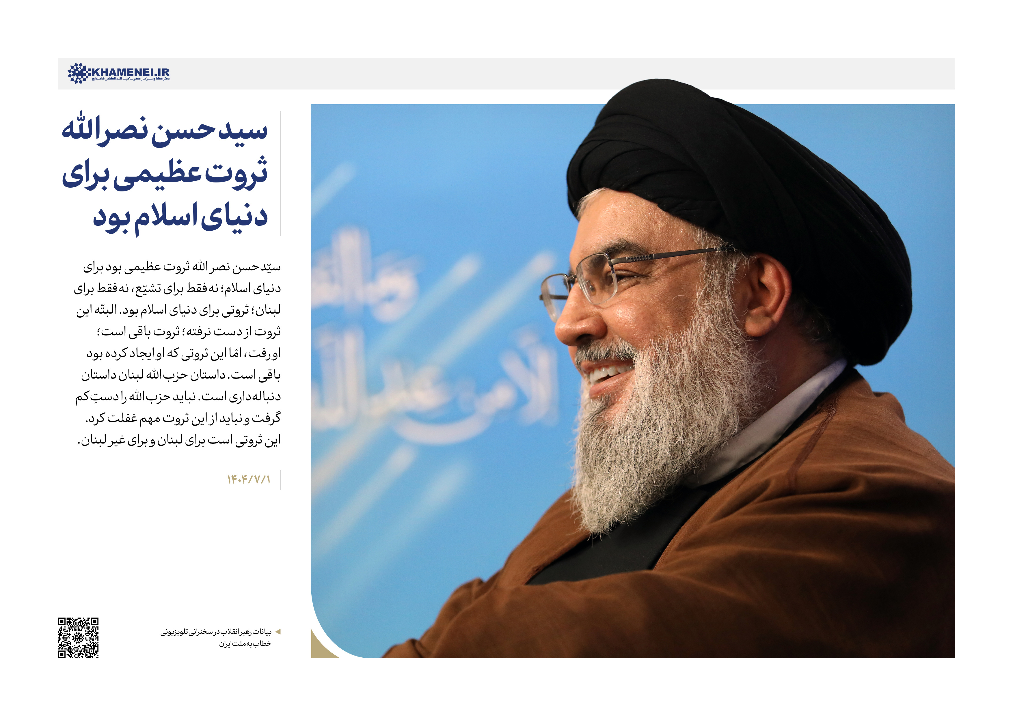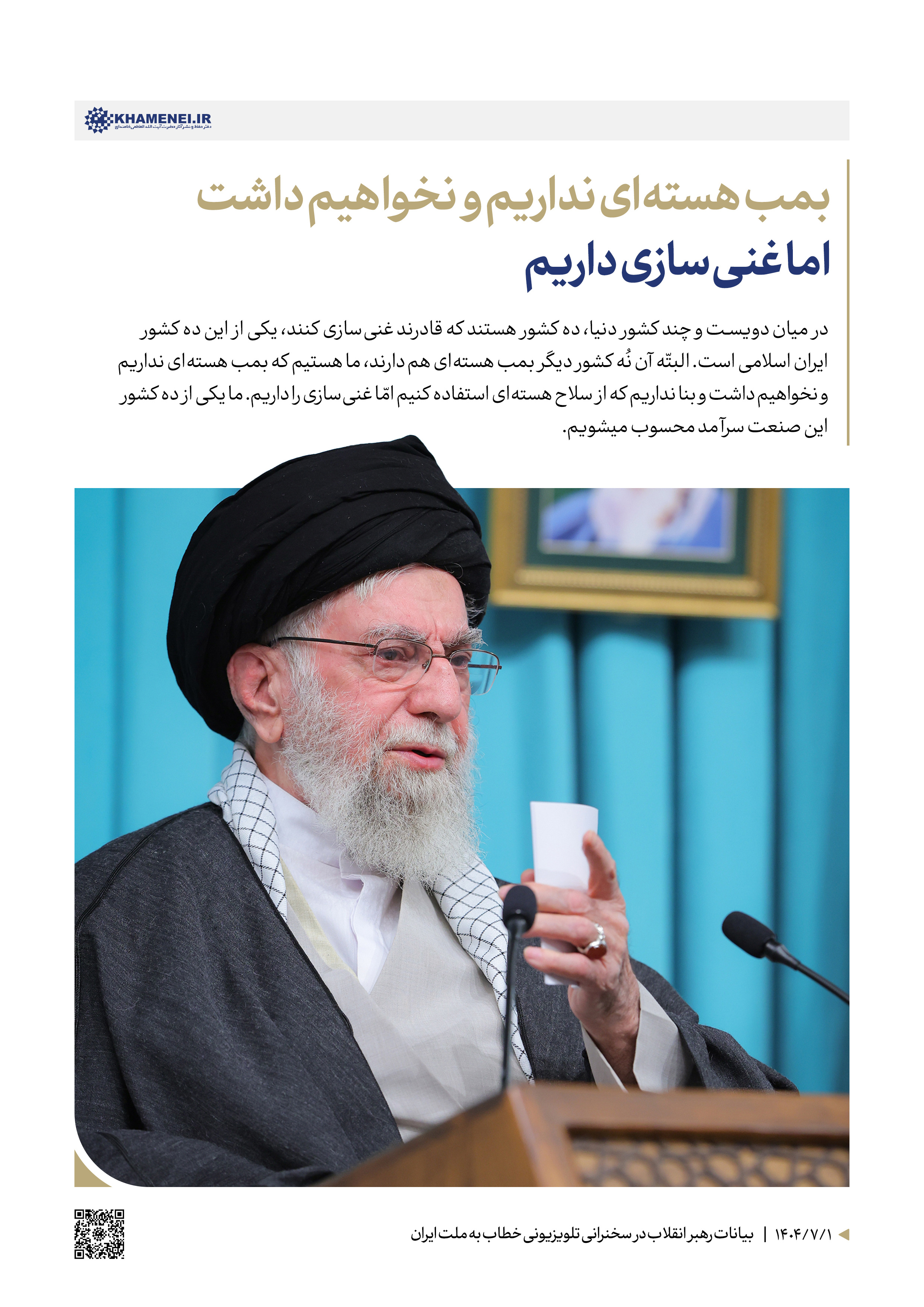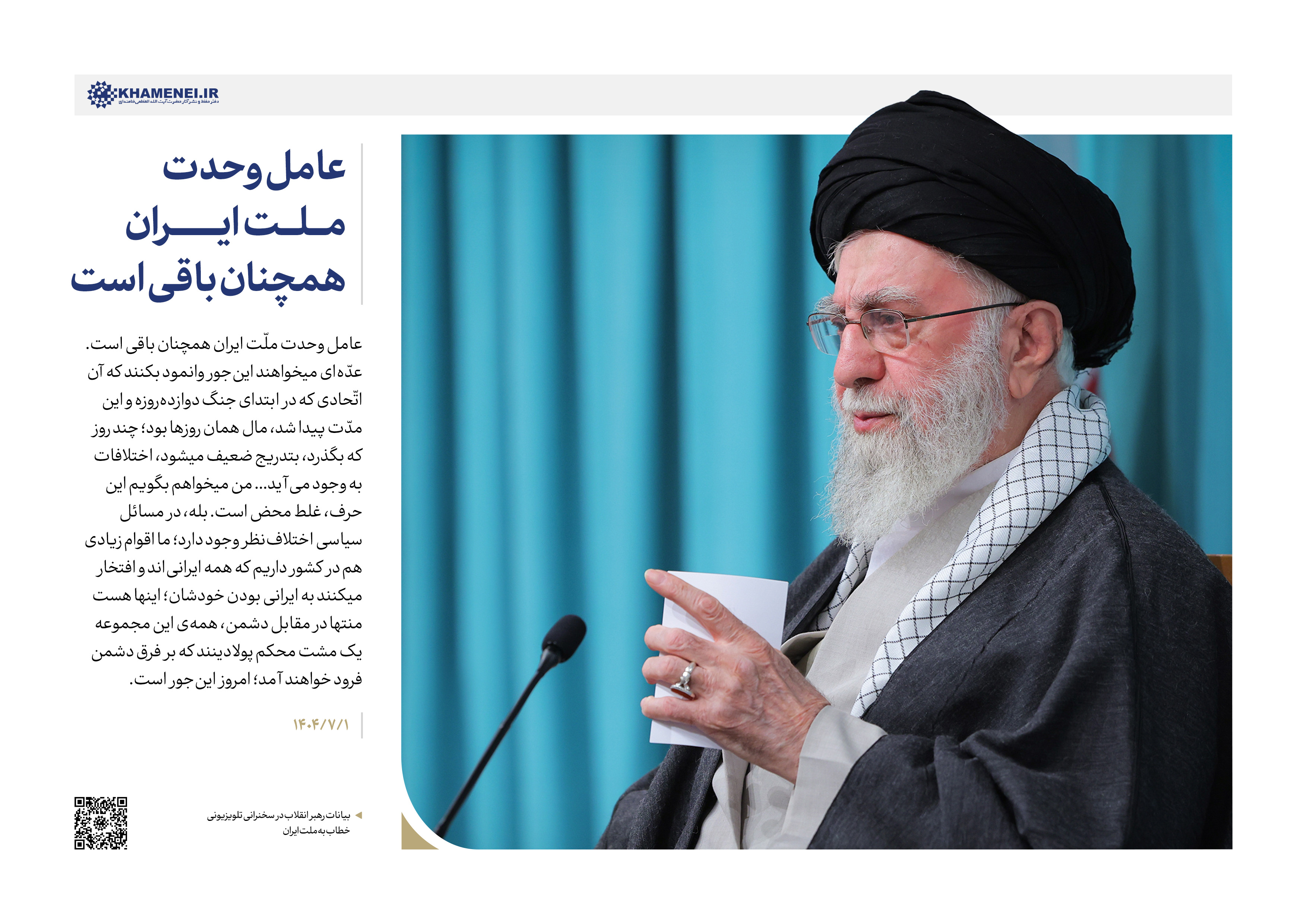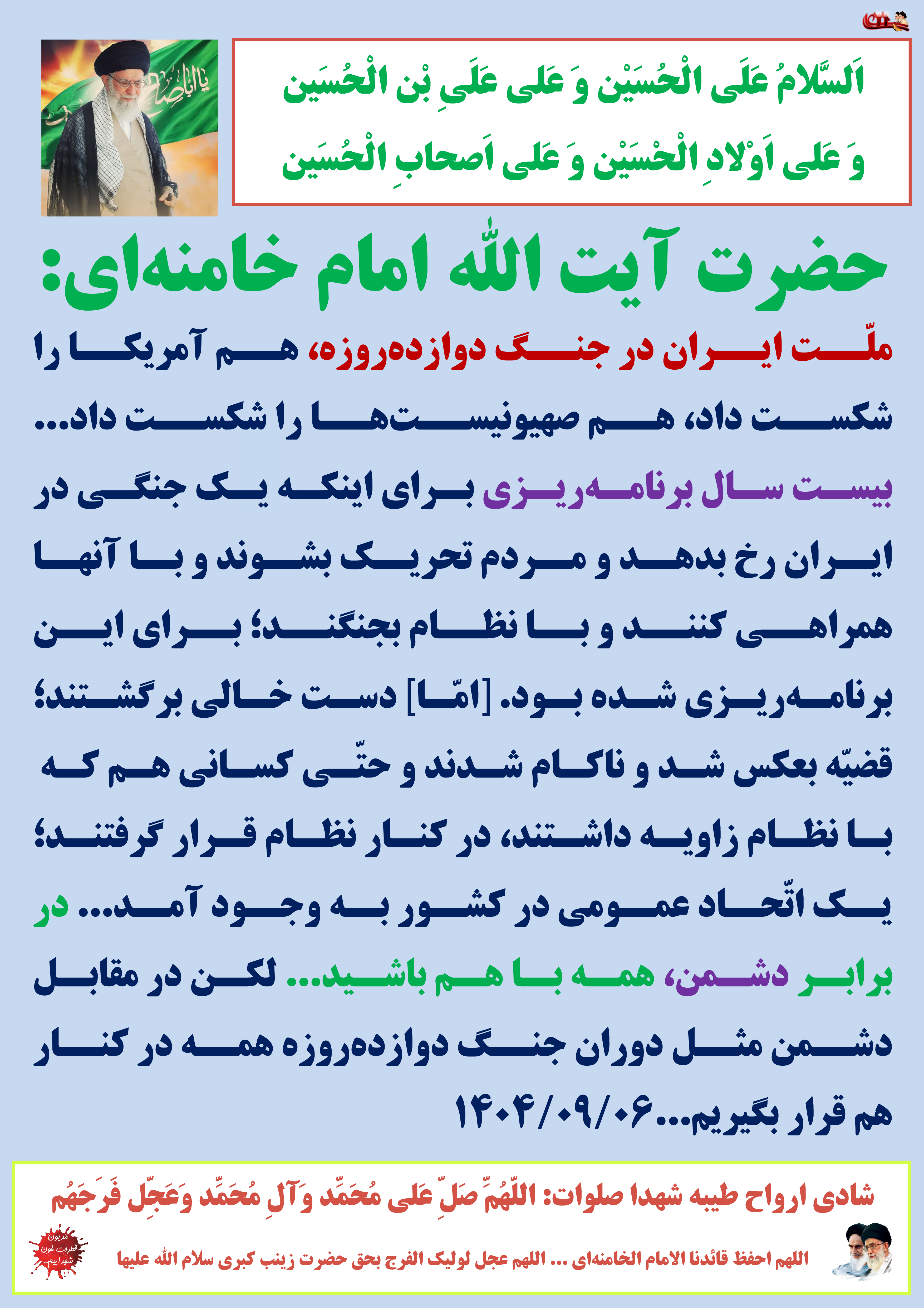 ملّت ایران در جنگ دوازدهروزه، هم آمریکا را شکست داد، هم صهیونیستها را شکست داد... بیست سال برنامهریزی برای اینکه یک جنگی در ایران رخ بدهد و مردم تحریک بشوند و با آنها همراهی کنند و با نظام بجنگند؛ برای این برنامهریزی شده بود. [امّا] دست خالی برگشتند؛ قضیّه بعکس شد و ناکام شدند و حتّی کسانی هم که با نظام زاویه داشتند، در کنار نظام قرار گرفتند؛ یک اتّحاد عمومی در کشور به وجود آمد... در برابر دشمن، همه با هم باشید... لکن در مقابل دشمن مثل دوران جنگ دوازدهروزه همه در کنار هم قرار بگیریم...۱۴۰۴/۰۹/۰۶