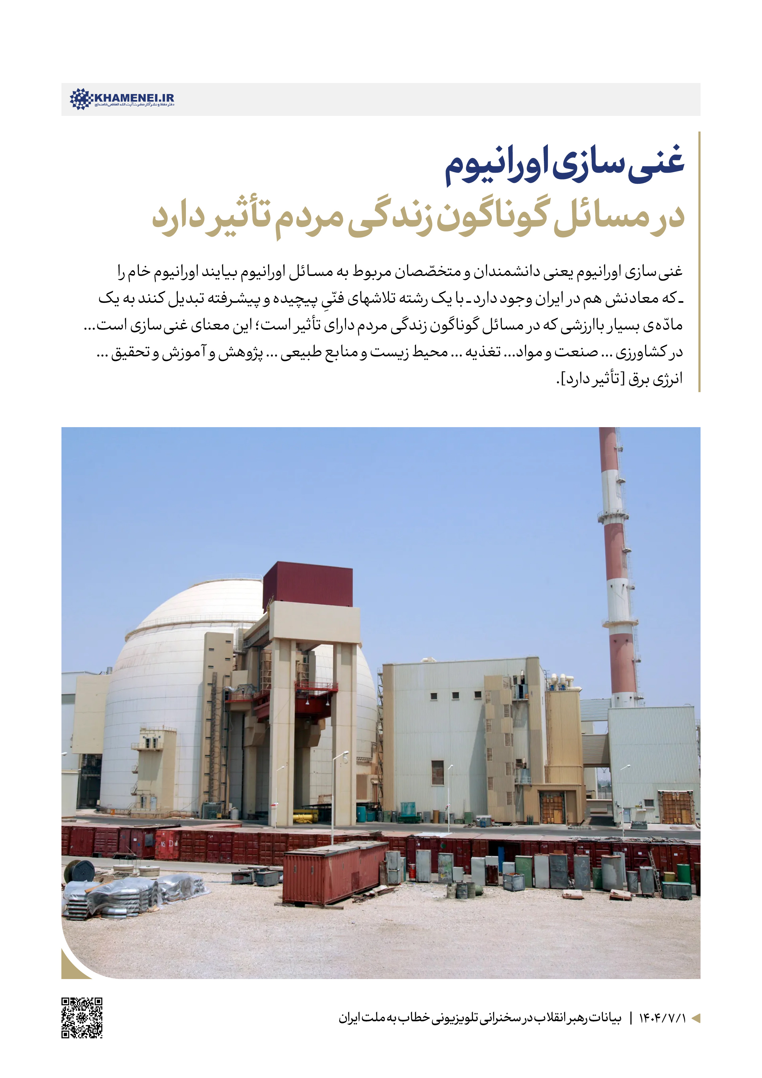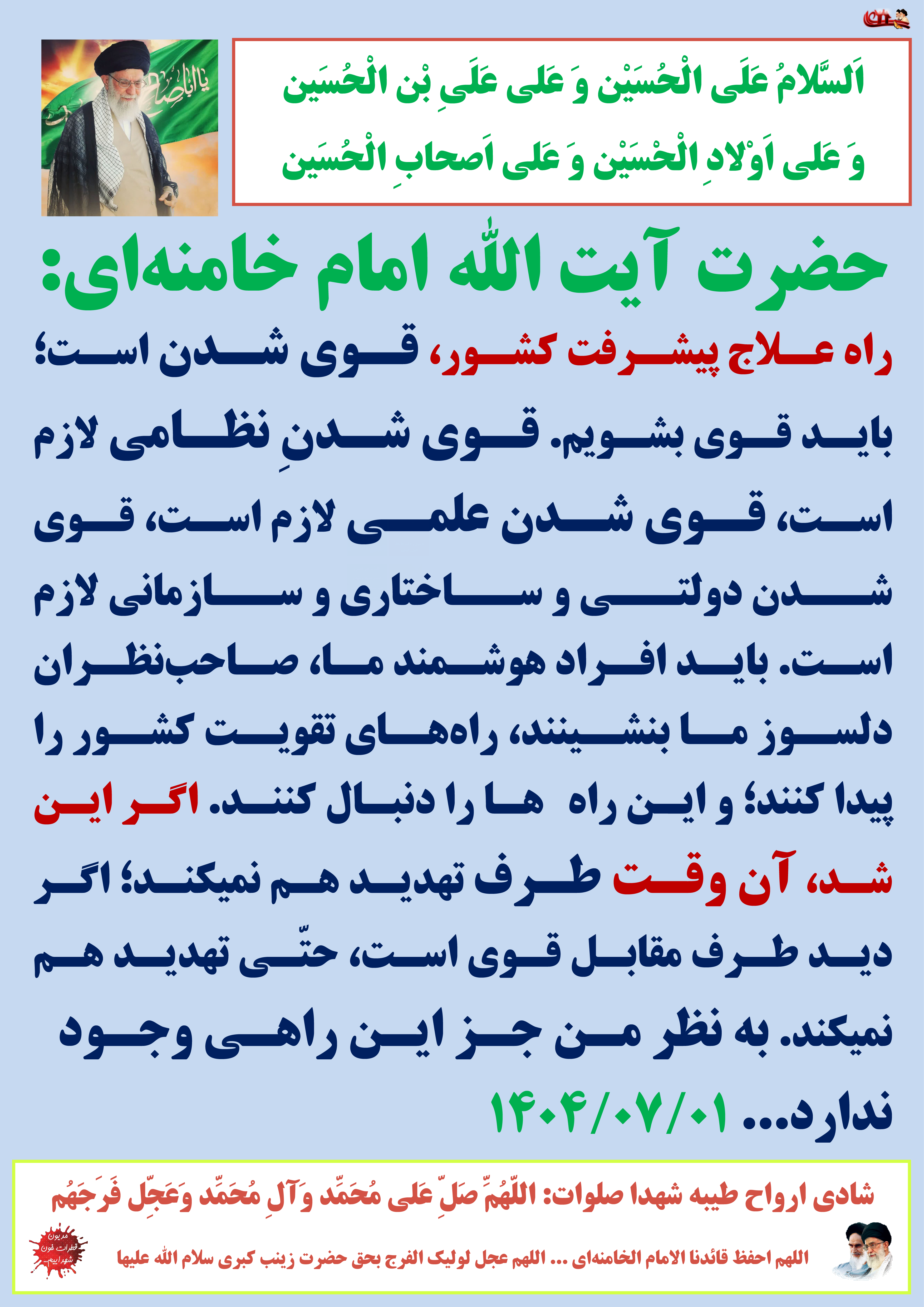 راه علاج پیشرفت کشور، قوی شدن است؛ باید قوی بشویم. قوی شدنِ نظامی لازم است، قوی شدن علمی لازم است، قوی شدن دولتی و ساختاری و سازمانی لازم است. باید افراد هوشمند ما، صاحبنظران دلسوز ما بنشینند، راههای تقویت کشور را پیدا کنند؛ و این راهها را دنبال کنند. اگر این شد، آن وقت طرف تهدید هم نمیکند؛ اگر دید طرف مقابل قوی است، حتّی تهدید هم نمیکند. به نظر من جز این راهی وجود ندارد... ۱۴۰۴/۰۷/۰۱