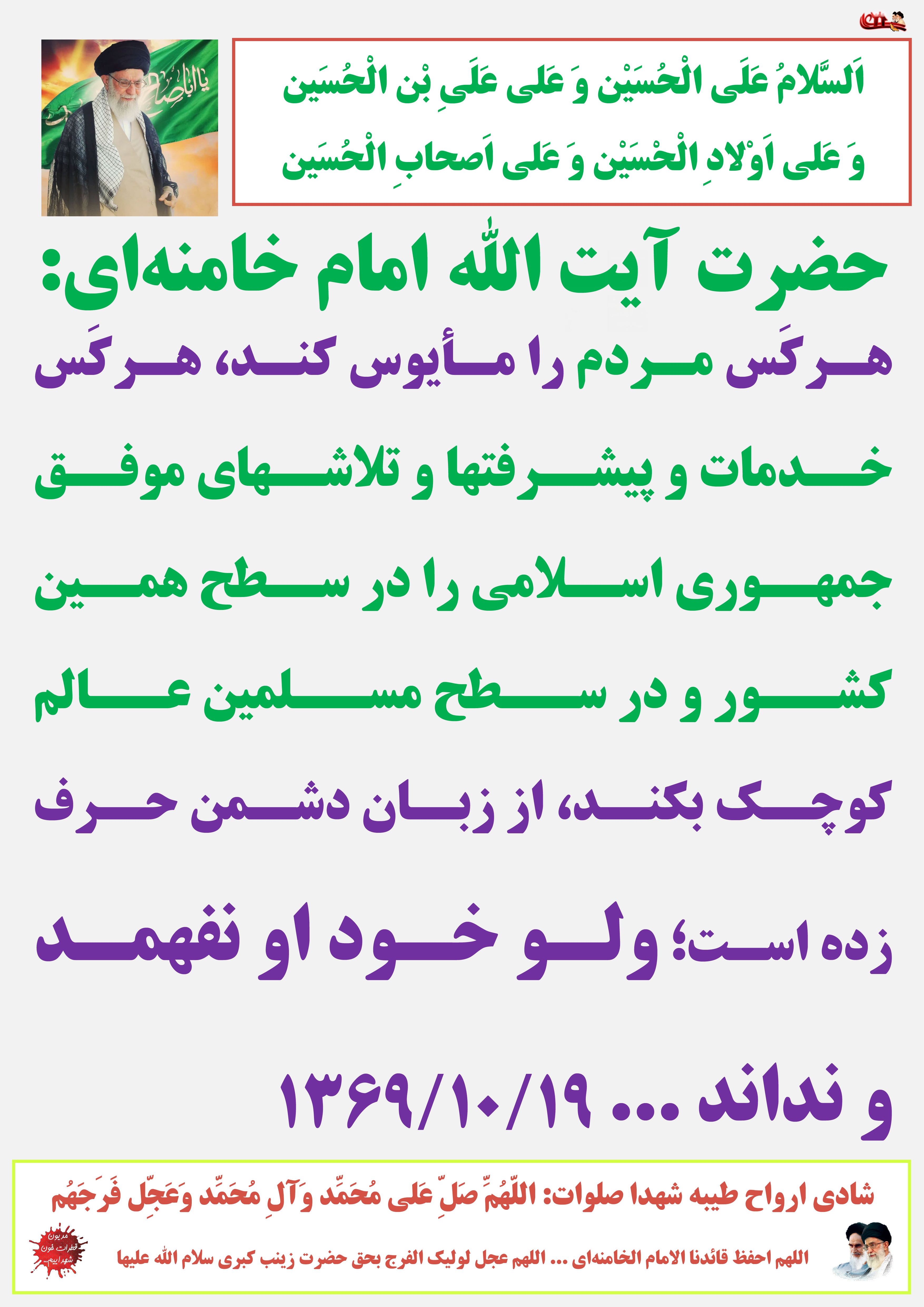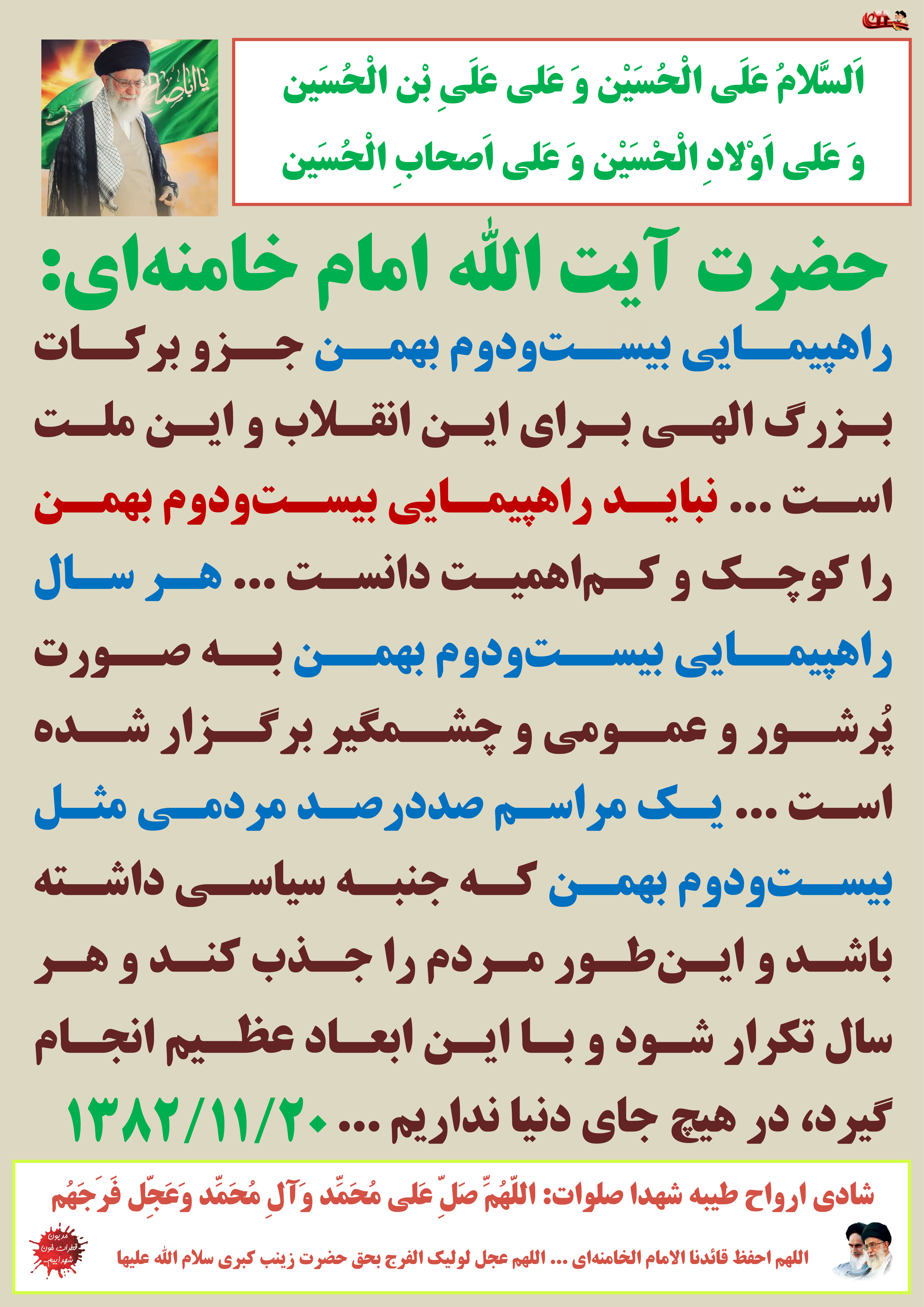 رهبر عزیزم را که راه امام عصر را ادامه میدهد فراموش نکید و یاریش نمائید ...