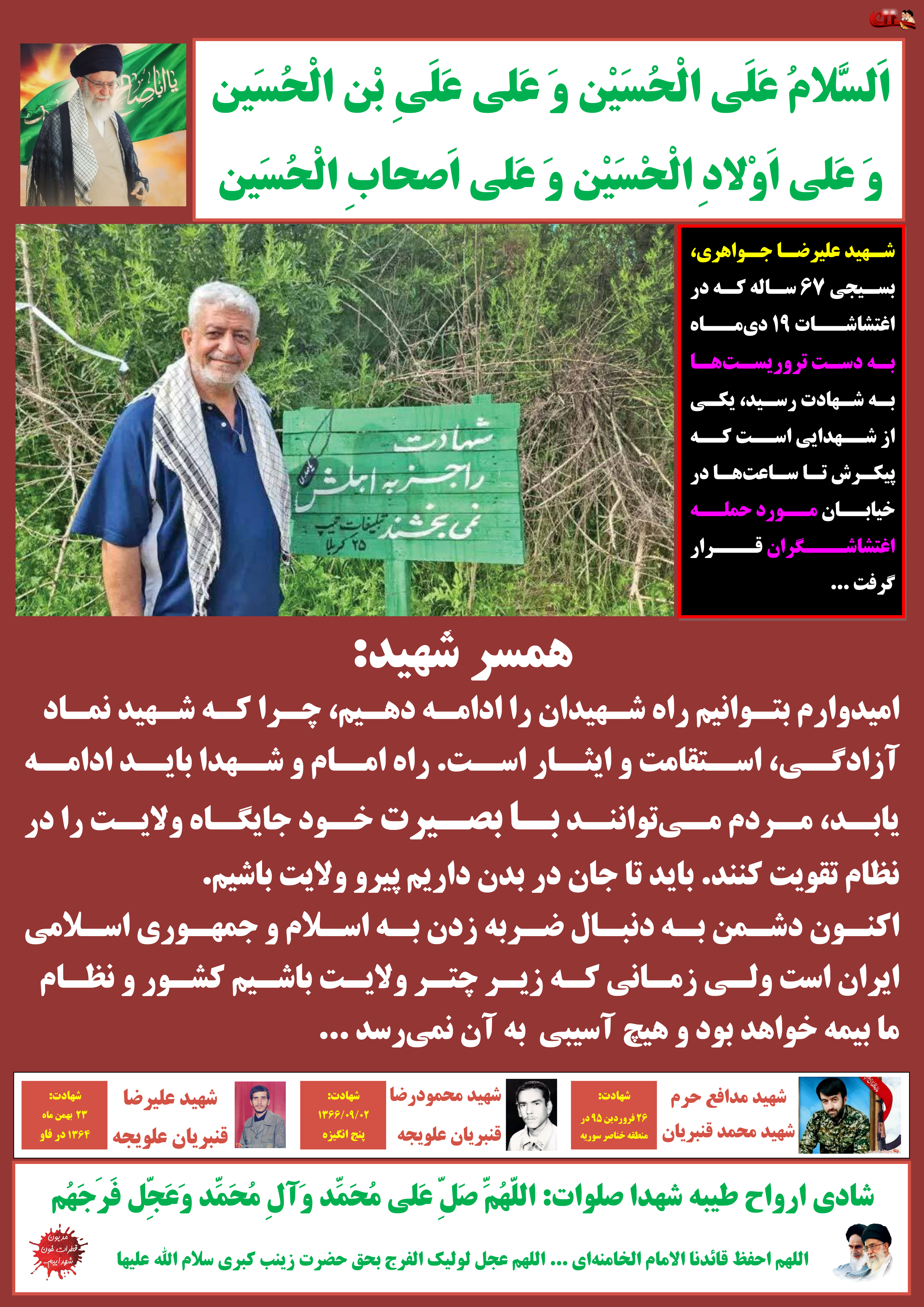 اگر میخواهیم این امنیت و ثبات بر قرار باشد باید گوش به فرمان ولی فقیه خود امام خامنهای (مدظله) باشیم و با تمام وجود از او حمایت کنیم و با تمام توان در مقابل استکبار جهانی مخصوصا آمریکا و اسراییل بایستیم، زیر بار ظلم و ستم آنها نرویم، ما شیعه هستیم غیرت داریم، نباید اجازه دهیم هرگز کشورمان بازیچه دست آنها قرار بگیرد؛ مکتب ما مکتب حسین (ع) است. ما فرزندان عاشوراییم و فریاد آزادی خواهی را سر میدهیم هرجا مظلومی به کمک ما احتیاج داشت به کمک او میشتابیم از مردن باک نداریم، اجازه نمیدهیم تکفیریهای پلید به نیت شیطانی خود دست پیدا کنند، همان طوری که مولای ما علی (ع) آنها را در خوارج ریشه کن کرد، با امید به خدا و صاحب و آقایمان امام زمان (عج) نسلشان را از روی زمین ریشه کن خواهیم کرد.