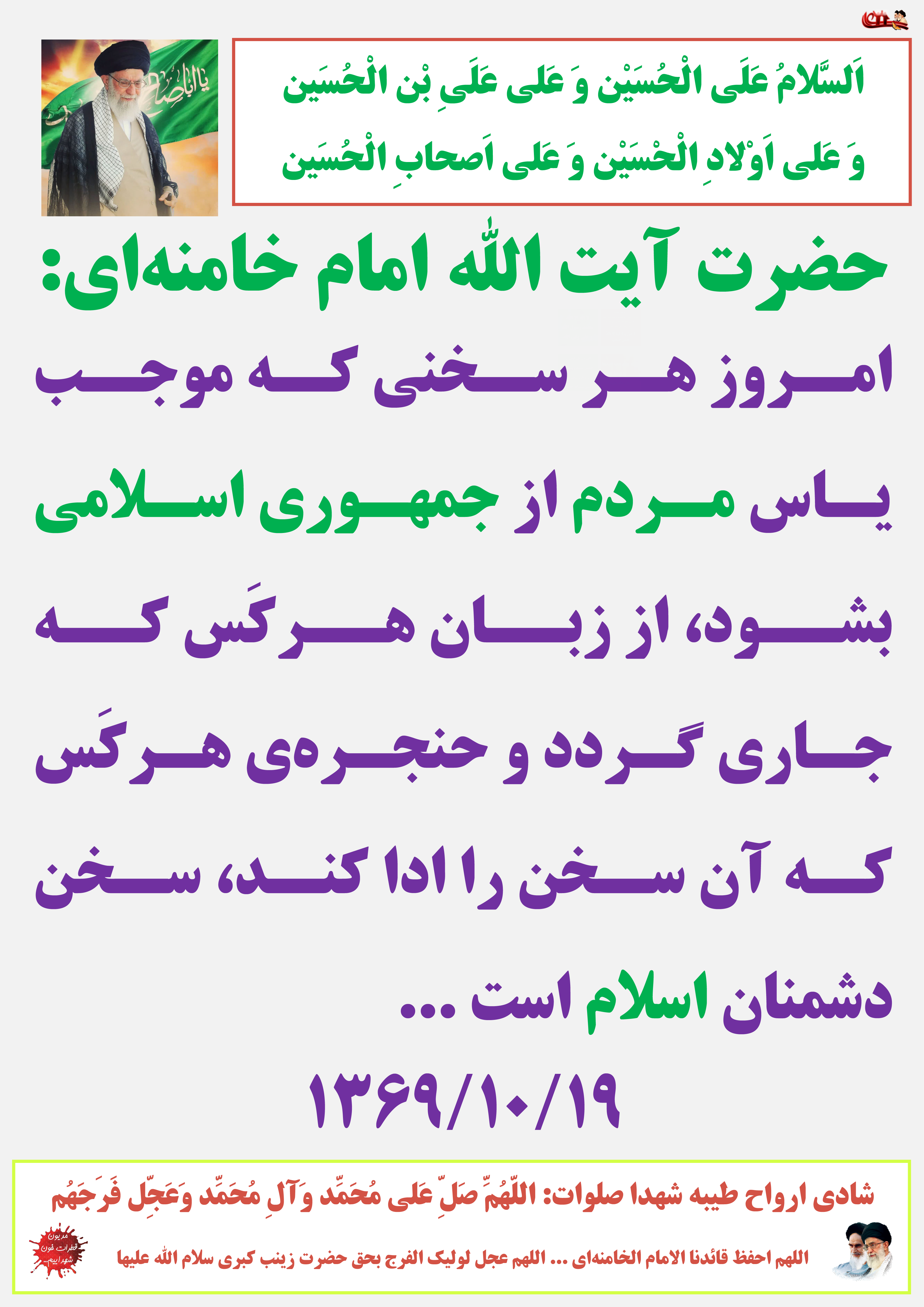 امروز هر سخنى که موجب یاس مردم از جمهورى اسلامى بشود، از زبان هرکَس که جارى گردد و حنجرهى هرکَس که آن سخن را ادا کند، سخن دشمنان اسلام است ...