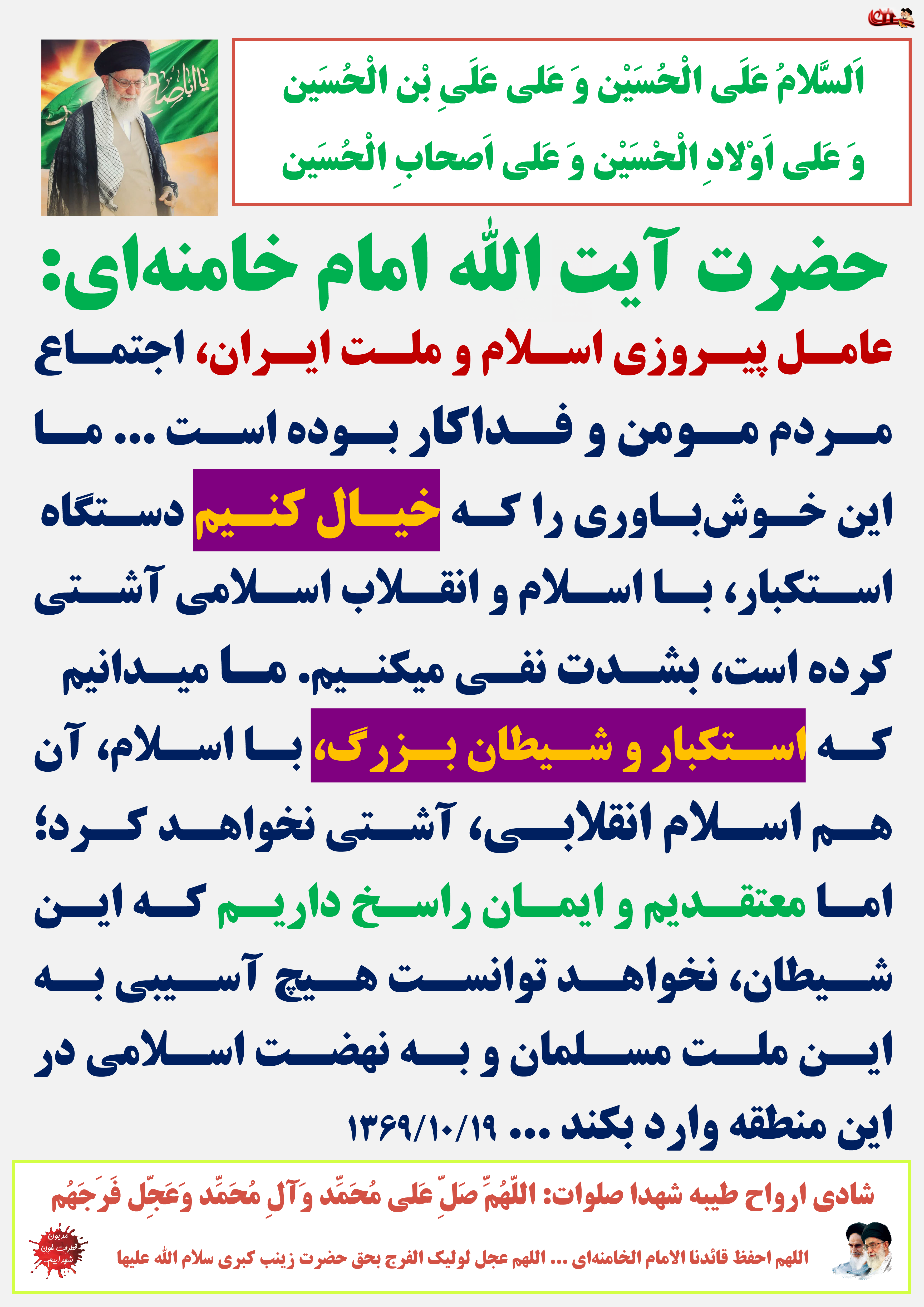 عامل پیروزی اسلام و ملت ایران، اجتماع مردم مومن و فداکار بوده است ... ما این خوشباوری را که خیال کنیم دستگاه استکبار، با اسلام و انقلاب اسلامی آشتی کرده است، بشدت نفی میکنیم. ما میدانیم که استکبار و شیطان بزرگ، با اسلام، آن هم اسلام انقلابی، آشتی نخواهد کرد؛ اما معتقدیم و ایمان راسخ داریم که این شیطان، نخواهد توانست هیچ آسیبی به این ملت مسلمان و به نهضت اسلامی در این منطقه وارد بکند ...