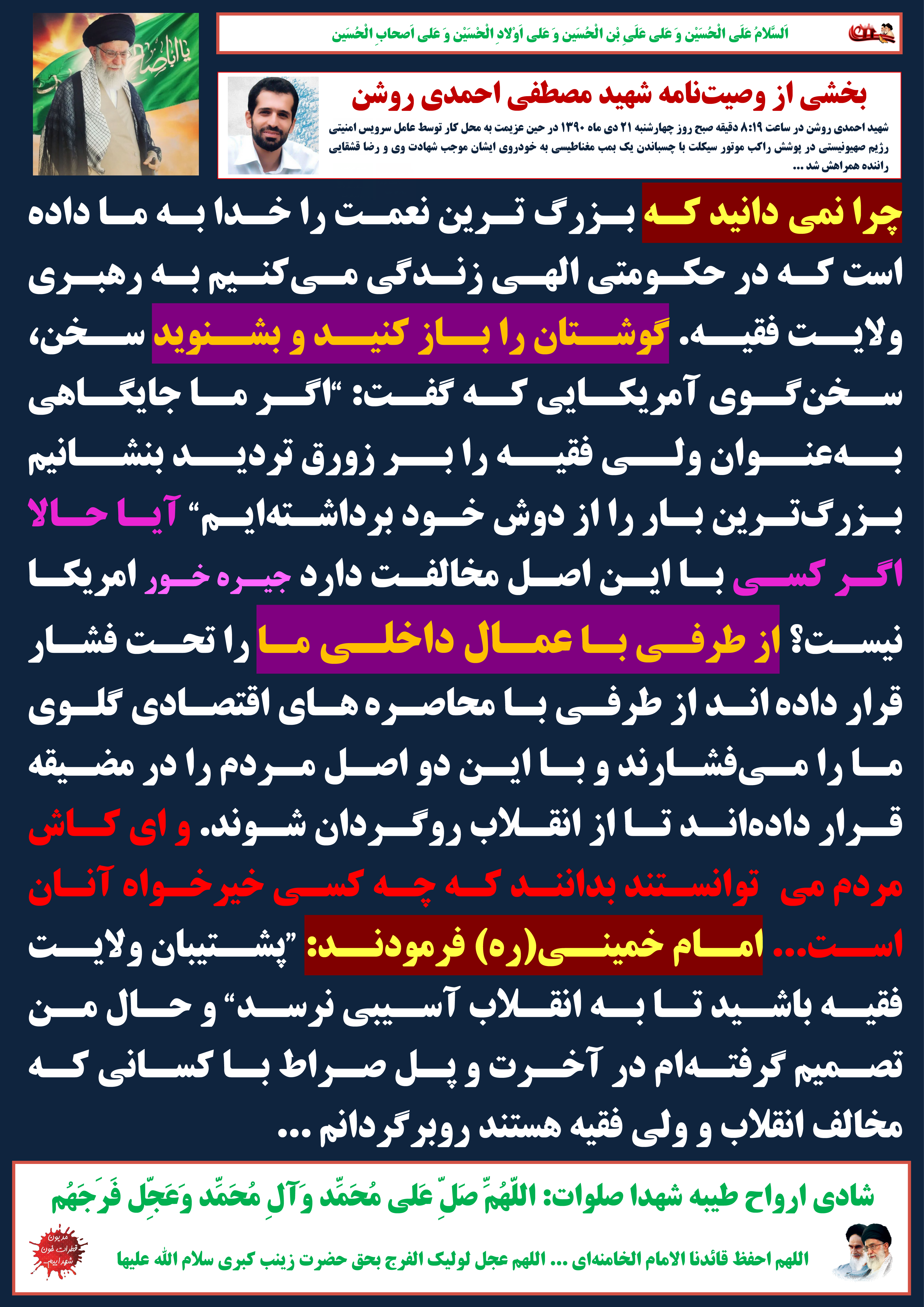 چرا نمیدانید که بزرگترین نعمت را خدا به ما داده است که در حکومتی الهی زندگی میکنیم به رهبری ولایت فقیه. گوشتان را باز کنید و بشنوید سخن، سخنگوی آمریکایی که گفت: “اگر ما جایگاهی بهعنوان ولی فقیه را بر زورق تردید بنشانیم بزرگترین بار را از دوش خود برداشتهایم” آیا حالا اگر کسی با این اصل مخالفت دارد جیره خور امریکا نیست؟ از طرفی با عمال داخلی ما را تحت فشار قرار دادهاند از طرفی با محاصرههای اقتصادی گلوی ما را میفشارند و با این دو اصل مردم را در مضیقه قرار دادهاند تا از انقلاب روگردان شوند. و ای کاش مردم میتوانستند بدانند که چه کسی خیرخواه آنان است... امام خمینی(ره) فرمودند: “پشتیبان ولایت فقیه باشید تا به انقلاب آسیبی نرسد” و حال من تصمیم گرفتهام در آخرت و پل صراط با کسانی که مخالف انقلاب و ولی فقیه هستند روبرگردانم ...